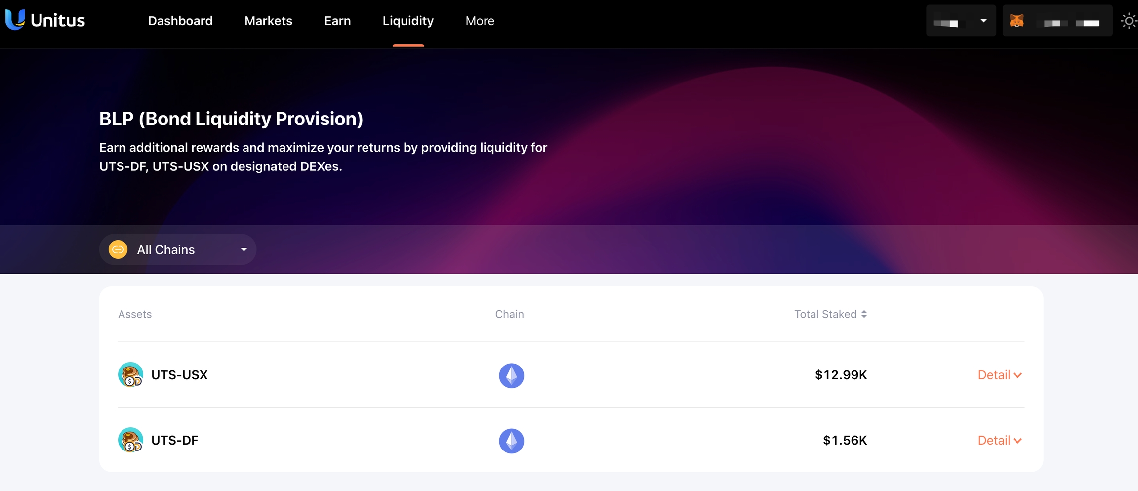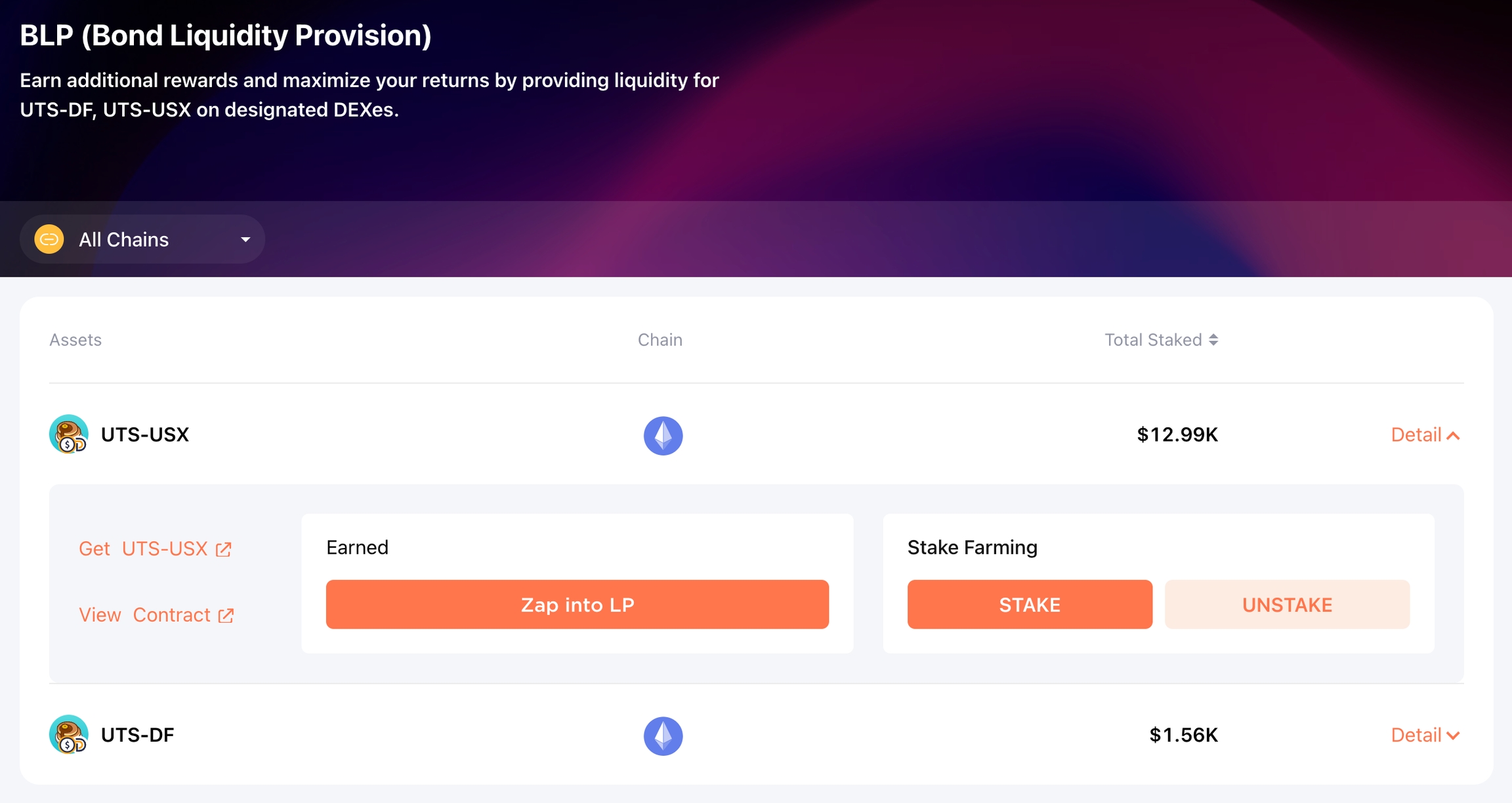 On the liquidity page, select the network and click on the UTS paired pool for which you want to provide liquidity.