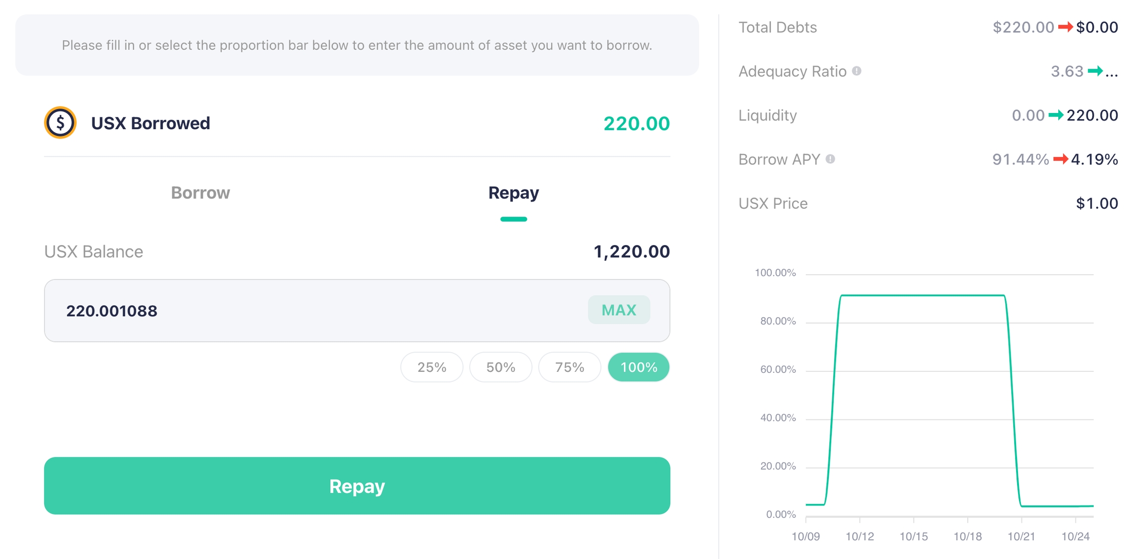 Enter the amount of borrowed assets you wish to repay or click on ‘Max’ to repay all.