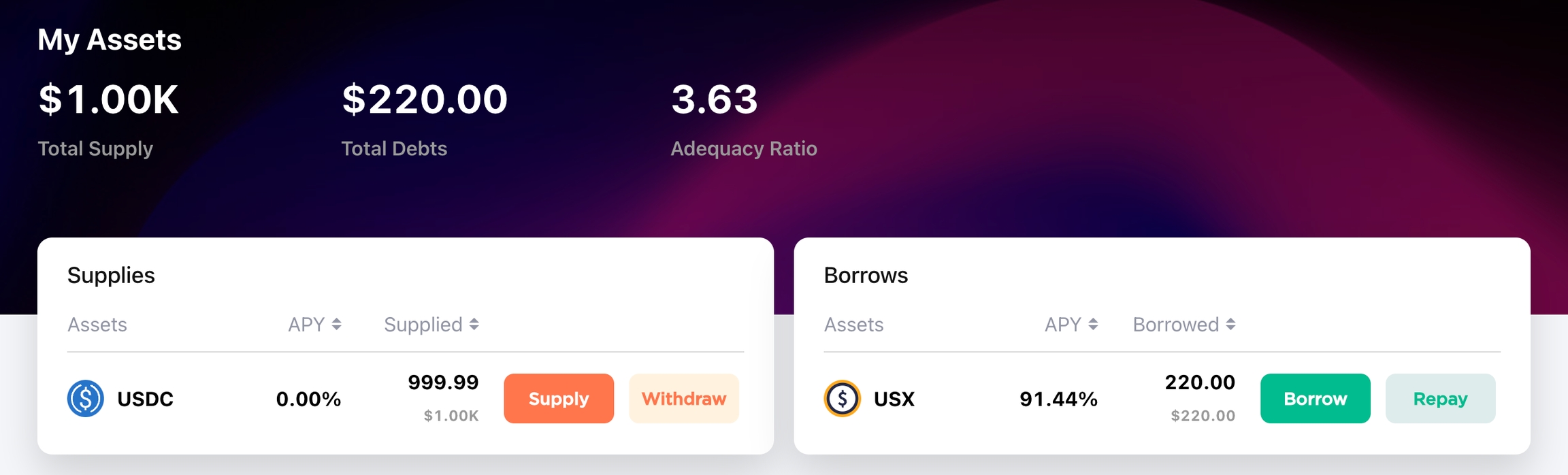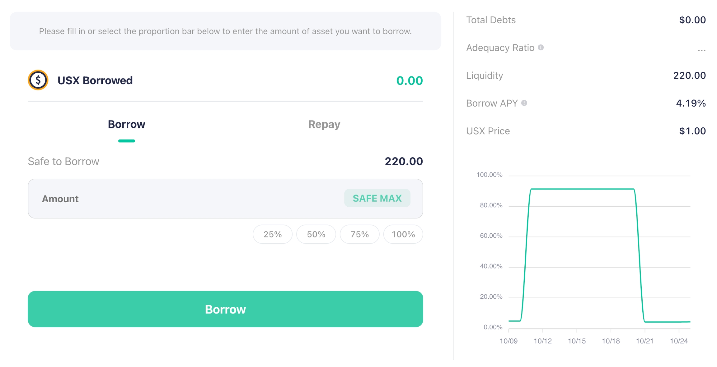 On the asset page, enter the amount of the asset you wish to borrow, or simply click on the maximum amount suggested by Unitus to ensure your Adequacy Ratio remains above 1 and avoid the risk of liquidation.