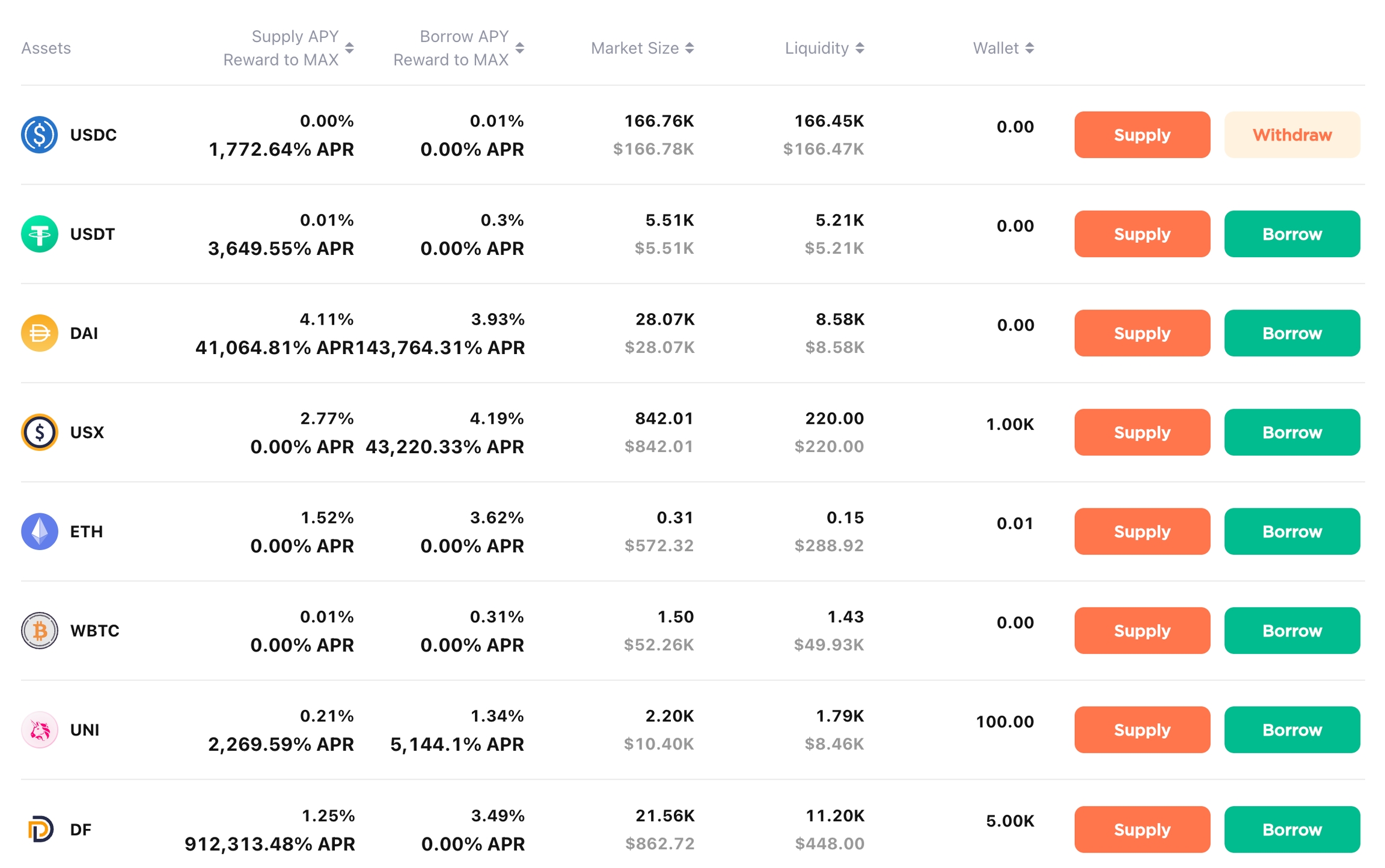 Once you deposit assets and enabled it as collateral to back your loans on Unitus, you can go to the Dashboard and select the asset you wish to borrow, and enabled Go to the Dashboard and select the asset you wish to deposit into Unitus in order to start earning.