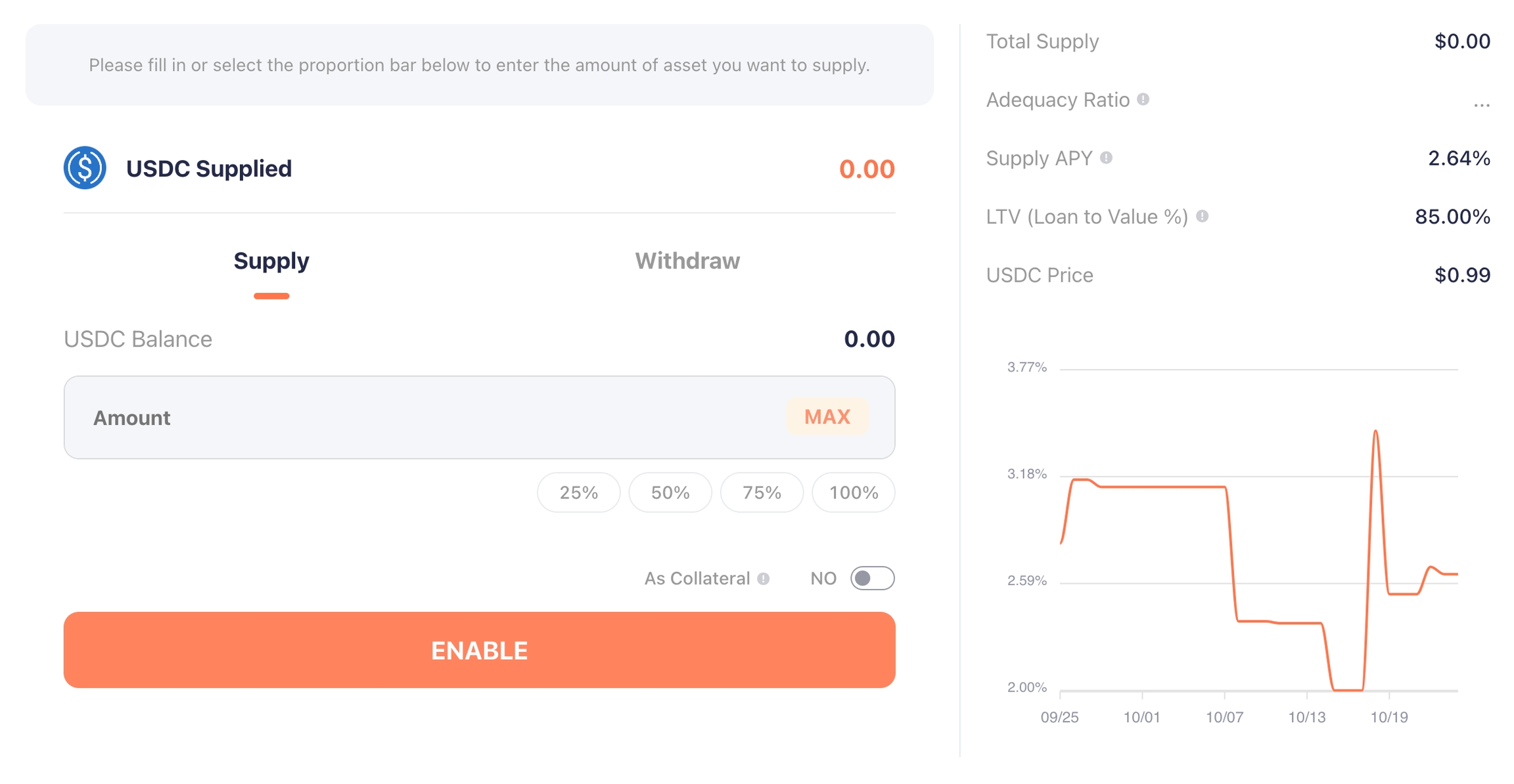 On the asset page, enter the deposit amount and choose to enable it as collateral if you plan to use the deposited assets as collateral for a loan.